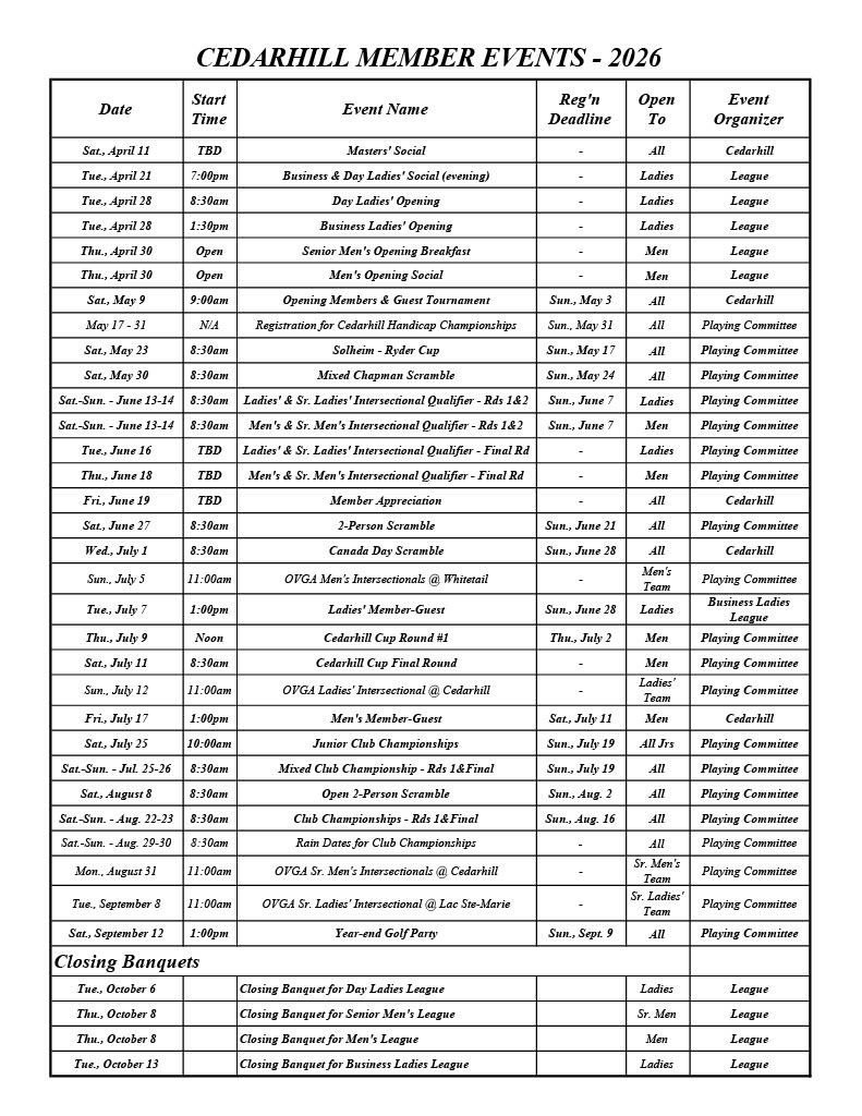 As we look back on this past year, we want to share our heartfelt gratitude. First, a special thank you to Matt Willman, Cedarhill’s Operations Manager, whose dedication and support have been invaluable. Matt and his team go above and beyond to make sure our member events are truly memorable. A big thank you also goes to our Pro, Greg White, who works tirelessly to ensure our events run smoothly, and to Barry Laphen, our Associate Pro—together, Greg and Barry make Cedarhill proud with what we consider to be the best Pro team in Ottawa.